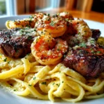 Savor a rich and creamy Alfredo pasta topped with perfectly blackened steak and shrimp, blending bold spices with tender, succulent protein for a satisfying dinner.