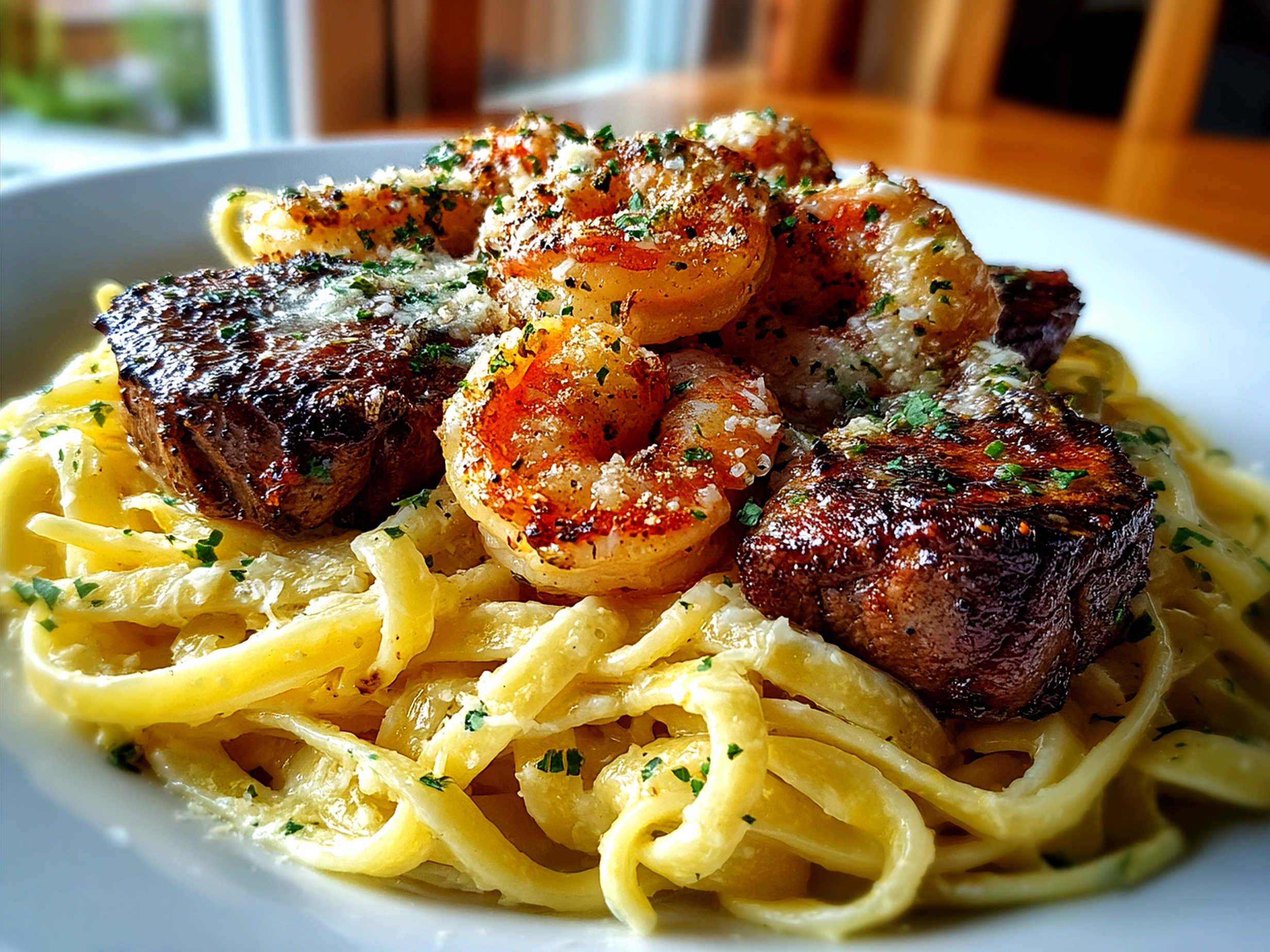 Absolutely. You can season and cook the steak and shrimp earlier in the day and reheat gently before serving. The Alfredo sauce is best made fresh, but if you do make it ahead, warm it slowly on the stove and add a splash of cream to bring it back to life.