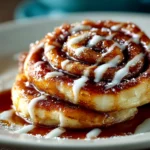 Fluffy pancakes swirled with cinnamon sugar and topped with a creamy vanilla glaze, perfect for a cozy breakfast or brunch treat.