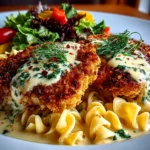 Can I make parts of this crispy chicken schnitzel Alfredo ahead of time? Absolutely! You can bread the chicken a few hours ahead and keep it covered in the fridge until ready to fry. The Alfredo sauce also reheats well if made in advance, just warm gently with a bit of cream to loosen it.