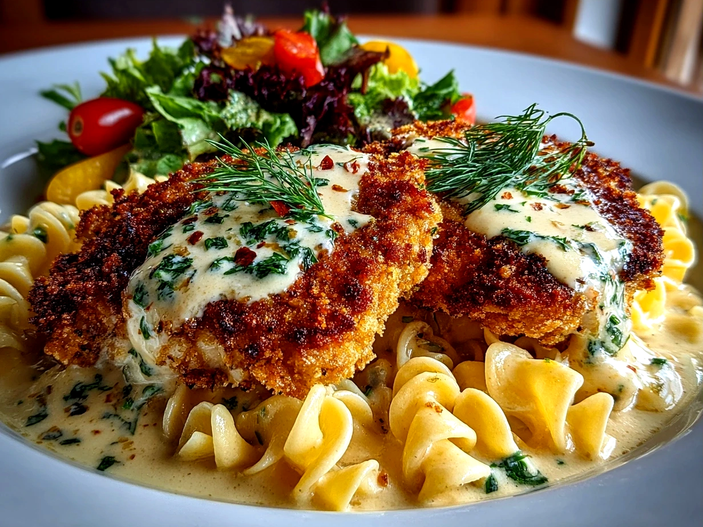 This crispy chicken schnitzel Alfredo combines tender, breaded chicken with a rich and creamy Alfredo sauce for a delicious twist on a classic Italian favorite.