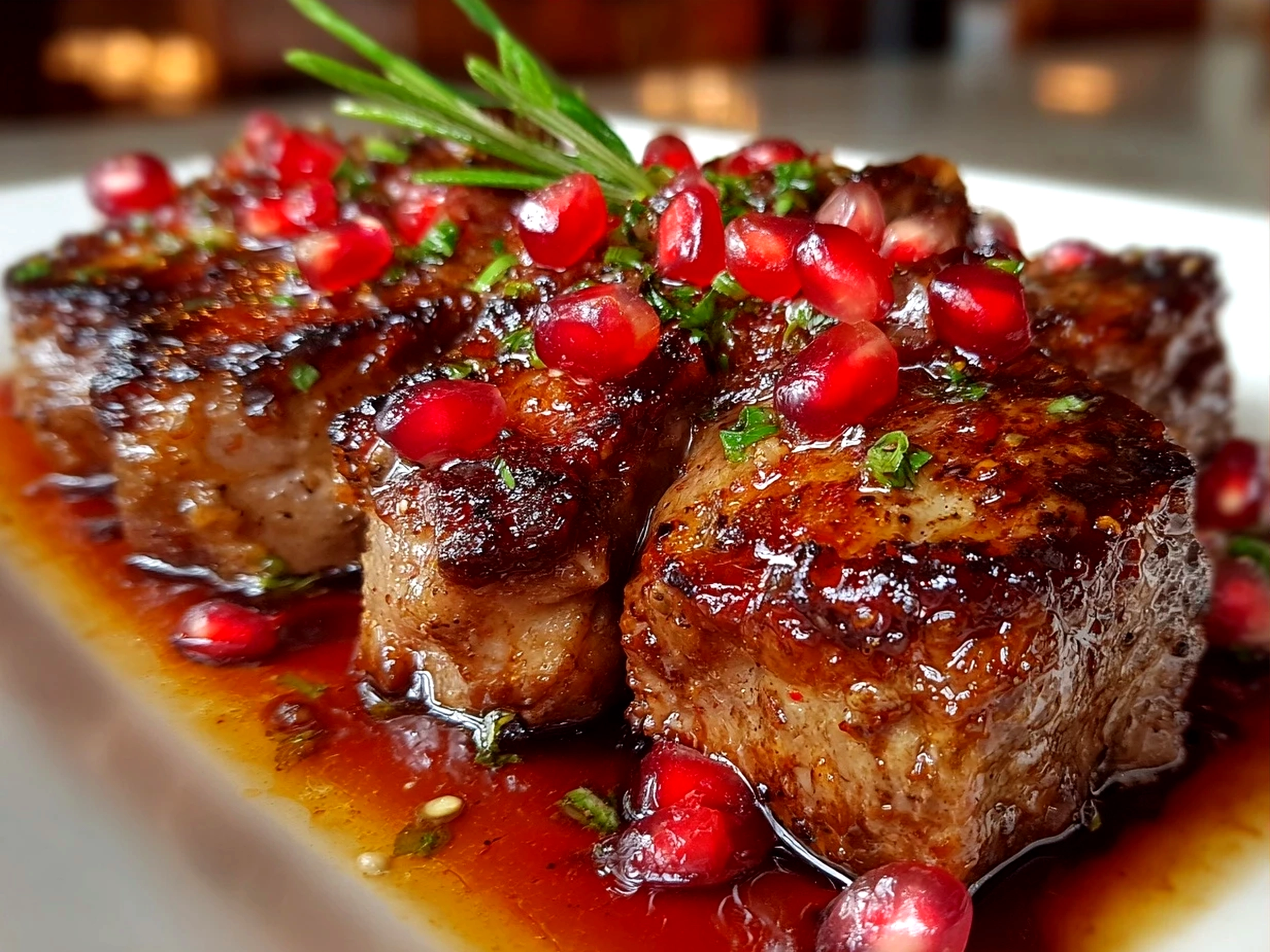 Succulent lamb chops glazed with a tangy and sweet pomegranate sauce, perfect for an elegant dinner that balances rich flavors and a vibrant finish.