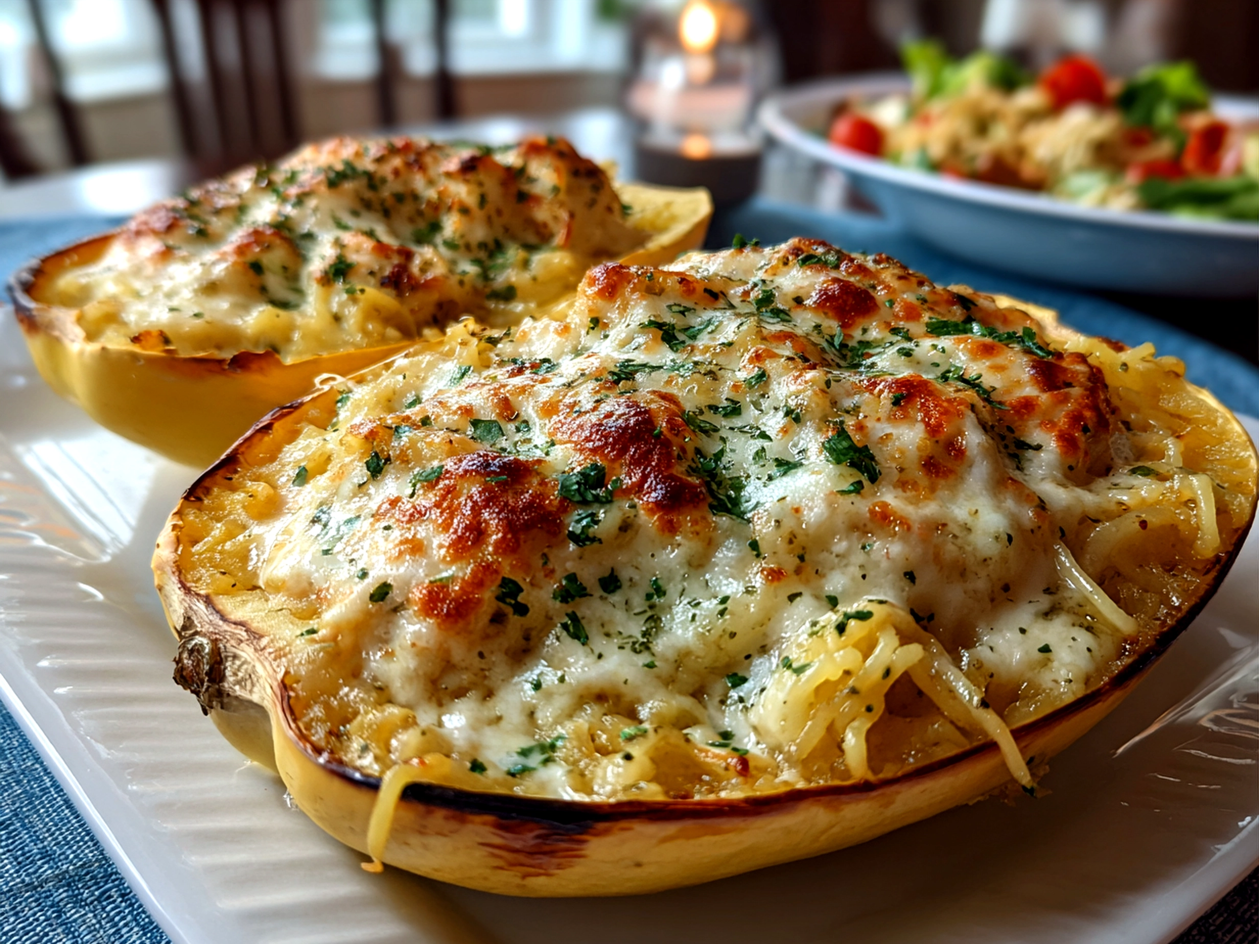 - Garnish with fresh chopped parsley or basil before serving. Your kitchen will smell amazing when this Spaghetti Squash Alfredo Boats is ready—creamy, garlicky, and inviting.